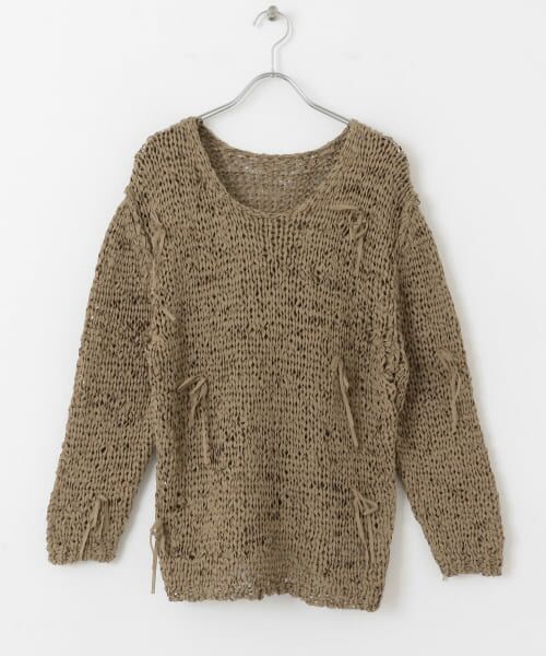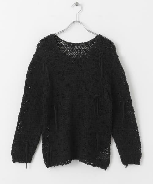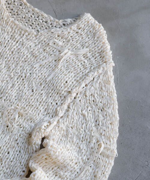 表情のあるリボンテープのような糸と同素材のリボンを散りばめ、着るだけでテンションのあがる一着。