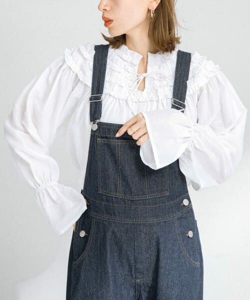 甘さとカジュアルのバランスが取れるデニムアイテムとの合わせがオススメ。サロペットとも好相性◎