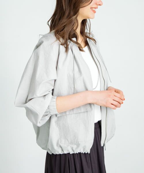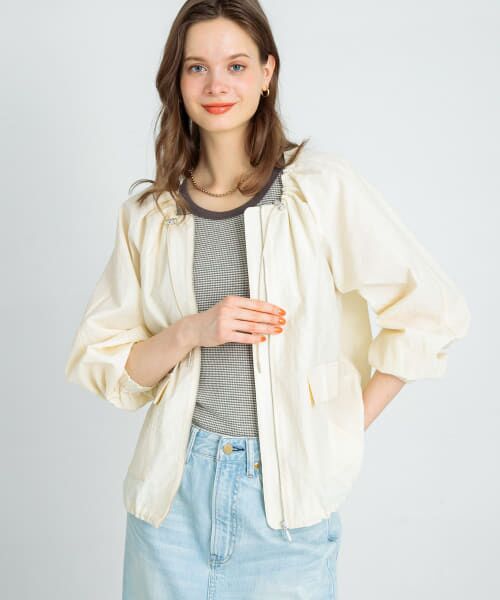 程よくハリ感のある素材を使用した軽い着心地のノーカラーブルゾン。