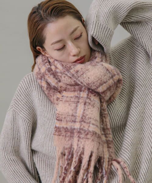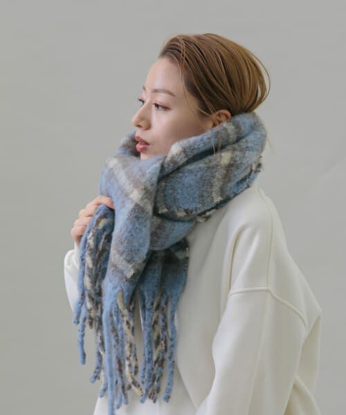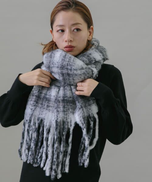 ボリューム感と華やかなチェック柄が映えるマフラー。