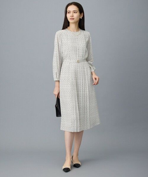 ■デザインフロントとバックにプリーツを施したワンピースです。ストンと落ちるシルエットなのでボディラインが気になりにくく、プリーツを中心に入れることで縦のラインが強調されるのでスタイルアップして見えます。共ベルトでウエストマークをした着こなしもおすすめです。無地と丸みのある四角のモチーフの周りにアクセントとして色を加えた柄(554)、幾何柄を崩したようなドット柄(505)と新色のドット柄(533)の展開です。通勤やセレモニーシーン、お食事会などに活躍します。■素材適度な肉感で重くなく、ハリ感とドレープ性のあるポリエステル素材です。マットな質感とソフトな風合いで、ナチュラルなストレッチ性があり着心地の良い素材です。シワになりにくいのもポイントです。