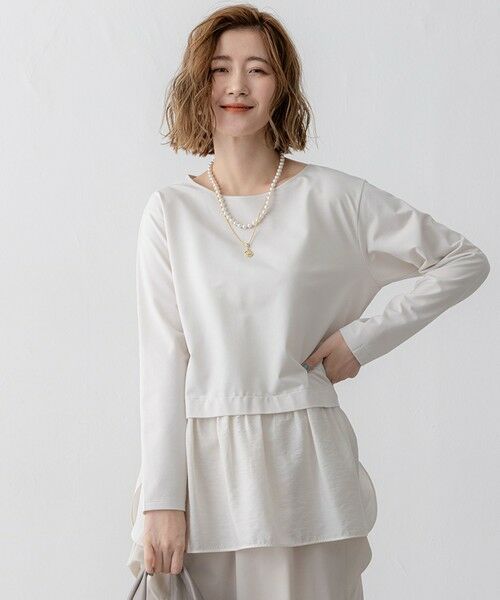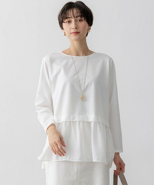 しなやかなシャツテールシルエットのコンビカットソー。肩が少しドロップしたほど良い抜け感のボディに、ウエストからギャザーを入れ、ヒップ回りが張りつかないように仕上げました。一枚で着るのはもちろん、ジャケットやカーディガンを羽織って裾のデザインをワンポイントにしても、クロップド丈のカットソーやニットのインナーとして裾をレイヤードさせてもバランスよく決まります。さまざまなスタイルにマッチし、つい毎日手に取りたくなる便利なアイテムです。カラーは清潔感のあるホワイト(#001)、印象が引き締まるブラック(#005)、やわらかな雰囲気のベージュ(#033)の3色展開です。