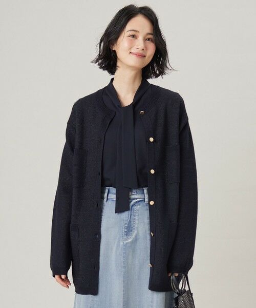 様々な糸を組み合わせてツイードを表現したニットアウター■デザインツイードジャケットのようなきちんと感と、ニットならではの快適な着心地を兼ね備えたニットアウターです。シンプルなデザインでありながら、前身頃のポケットがアクセントになっています。ヒップが隠れる長さで、ボトムを選ばず着て頂けます。ユニークな組織ながら色味はすっきりとまとめることで上品に仕上げました。■素材様々な糸を組み合わせることで繊細なツイードを表現しているニット素材です。柔らかなコットン、膨らみのあるストレッチ糸、光沢感のあるナイロン糸など特徴の異なる素材を表面に凸凹ができるように編むことで、より立体的にツイーディーに表現しています。■同素材アイテムプルオーバーニット(KRW7GM0252)