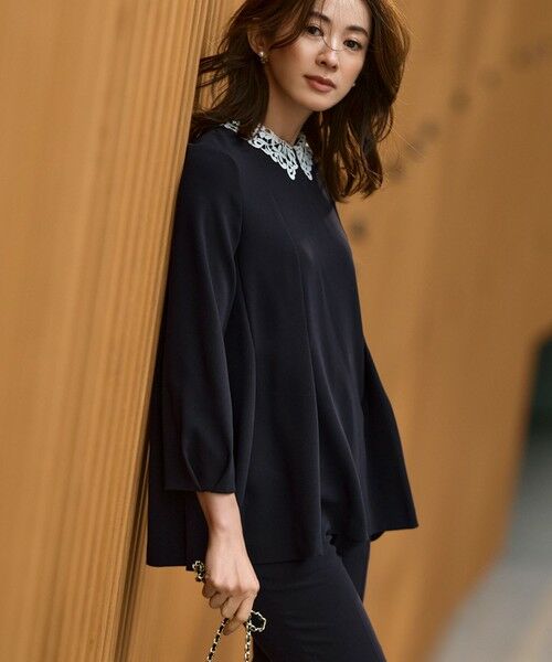 名品ジョーゼット地にヴィンテージライクなレース襟がアクセントになったブラウス。レース襟は取り外し可能な2WAY仕様です。レース襟を外すと洗練されたシンプルな印象に、レース襟をつけると華やかなで上品な印象でご着用いただけます。また、ゆるやかなペプラムシルエットが大人かわいいを叶えてくれます。同素材のフルレングスパンツ(品番: PR23CS0003)やテーパードパンツ(品番: PR23SS0002)とセットアップでの着用がオススメです。普段使いはもちろん、セレモニーや家族行事、七五三、ビジネスなどのきちんとしたシーンにも対応可能。構築的なフォルムが凛とした甘さ演出してくれるので、お仕事シーンにも活躍してくれること間違いなしでです。カラーは明るくやさしいベージュ(#033)、合わせやすく落ち着いたネイビー(#075)の2色展開です。