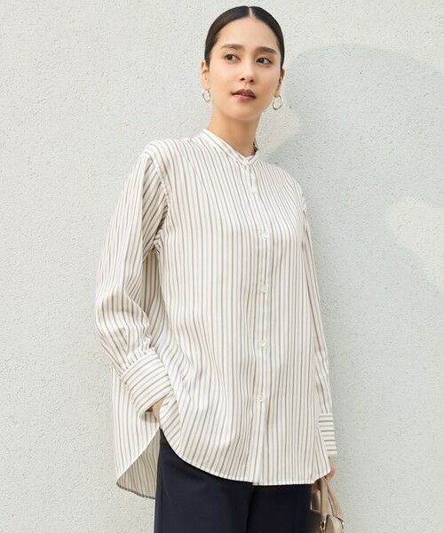 しなやかな落ち感のある女性らしい素材のバンドカラーブラウス■デザインシンプルなバンドカラーのブラウスです。肩幅と身頃に程よくゆとりを持たせ、しなやかな素材の落ち感と相まって大人っぽい抜け感を感じられるシルエットに仕上げました。1枚ではもちろん、コンパクトなバンドカラーでニットのインナーとしてレイヤードしてもバランス良く着て頂けます。無地2色とストライプ2色の展開で、ラメブルーストライプ(173)カラーは、ストライプの白地に繊細なシルバーのラメを施しております。※画像はサンプルを使用しております。実際にお届けする商品は、ラメブルーストライプ(173)カラーのボタンホールが表地と同じブルーになります。■素材ポルトガルのSOMELOS社で織り上げた、セルロース系再生繊維のブラウス素材です。ストライプは自由区別注柄です。丁寧に織り上げられ、しなやかさ、ドレープ感、程よいハリ感の全てがバランス良く計算しつくされた仕上がりとなっております。ソフトな風合いで肌触りが柔らかく、シルクのような光沢感、清涼感があるため着心地の良い素材です。■同素材アイテムチュニックブラウス(BLW7GM0312)クロップド丈ブラウス(BLW7GM0313)