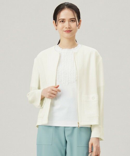 デイリーから通勤まで幅広いシーンで活躍するノーカラージャケット■デザインフロントファスナー開きのノーカラージャケットです。程よいボリューム感のボクシーなシルエットと、少しドロップした肩周りが今年らしい抜け感を感じるデザインです。さらりとしたタッチで軽い素材で仕立てることで、ジャケットでありながらもカーディガンのような着心地です。メッシュのような素材なので蒸れにくく、盛夏に向けて活躍する羽織りです。■素材特殊な染まり方をするスラブ糸を使用したカラミ組織の素材です。カラミ組織ならではの甘めな織りなので非常に軽く、適度な伸縮性もあり、独特なシャリ感とドライタッチな清涼感が特徴です。太さの異なるムラのあるスラブ糸を使用することで、梳毛調の雰囲気のある表面に仕上げています。