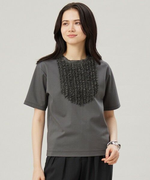 フロントのフリルディティールがフェミニンなTシャツ■デザイン薄地の生地を切りっぱなしにしギャザーを寄せた、胸元のフリルディティールが特徴の華やかなTシャツです。ブラウスライクで上品に仕上がっています。キレイ見えしながらベースはジャージなので、快適な着心地なのも嬉しいポイントです。■素材ストレッチ性に優れ、シワになりにくく、反発性とドレープ性がある素材です。上質な綿特有の繊細な光沢が特徴で、接触冷感、UVカット、速乾性の機能が付いているので、暑い時期にも着て頂きやすい素材です。特殊加工により肌離れがよく、乾きやすいように仕上げております。フロントのフリルは、薄地でありながら肌触りが滑らかで上品な風合いが特徴の素材です。