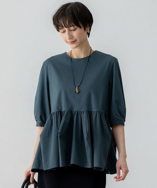 360度美しいシルエットのペプラムデザインのカットソー。ギャザーの所々にダーツを入れてシルエットを作りこむことで甘くなりすぎないシルエットに仕上げました。気になるヒップや二の腕のカバーを叶えつつ、華やかなデザインが一枚で決まりの良いアイテムです。シンプルなボトムと合わせてもコーデに映えます。汗じみ防止加工をほどこしているので、暑い時季にも安心して着用できるのもうれしいポイント。カラーは、清潔感のあるホワイト(#001)、抜け感のあるグレー(#004)、シックなブラック(#005)、エレガントな雰囲気のダークグリーン(#065)の4色展開です。