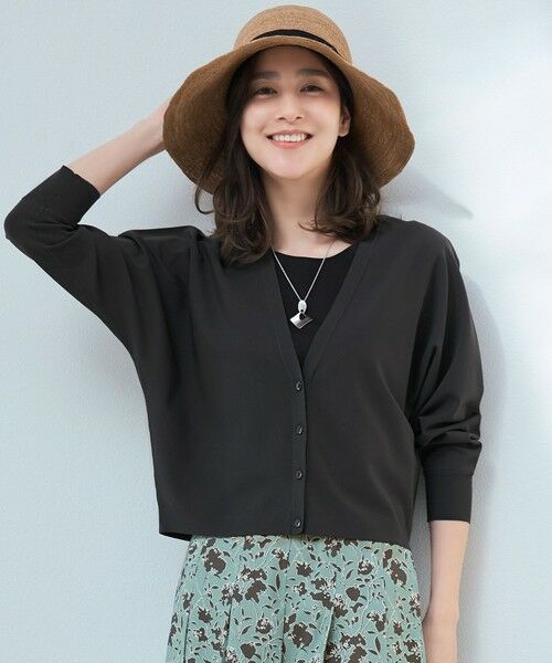 今年らしいフォルムのドルマンスリーブカーディガン■デザインドルマンスリーブのゆったりとした肩周りとコンパクトに絞った裾が特徴のボレロ風カーディガンです。お顔周りがすっきりと見えるVネックで、トレンド感のあるコンパクトな着丈の羽織りは、スタイリングに今っぽさをプラスしてくれます。同素材のレースコンビニット(KRWMGM0454)とアンサンブルで着て頂くのもおすすめです。■素材レーヨンとストレッチポリエステルを撚糸した糸を使用しております。ストレッチ性があるので動きやすく、身体に馴染みやすいのでストレスフリーな着心地です。撚りを強くかけているので、表面がクレープ状になっており、ドライタッチなシャリ感と清涼感がありながら、エレガントなドレープ性を合わせ持った素材です。接触冷感、UVカット機能付きです。■同素材アイテムプルオーバーニット(KRW7CM0452)Aラインニット(KRW7GM0451)レースコンビニット(KRW7GM0454)