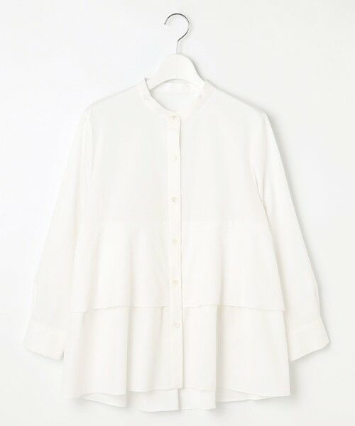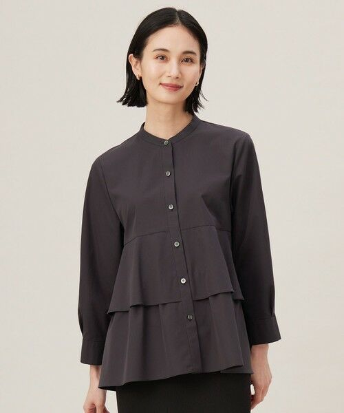 360度美しいシルエットのティアードブラウス■デザイン胸下から緩やかにフレアを出したチュニックブラウスです。フレアの切り替えを2枚重ねのティアードにすることで華やかな印象に仕上げています。ウエストよりも少し高い位置で切り替えることでお腹周りをカバーしてくれます。身頃と袖はややコンパクトにし、着丈に前後差をつけ、後ろに向かってなだらかに長くなる裾がヒップ周りを程よくカバーしつつ、すっきりと見えます。シンプルなパンツに合わせやすいバランスです。■素材細番手で高密度に作られていますが、ソフトな風合いに仕上げた綿100%の素材です。適度なハリがあり、滑らかでしなやかな肌触りです。着用時の透け感があまり気にならないのもポイントです。