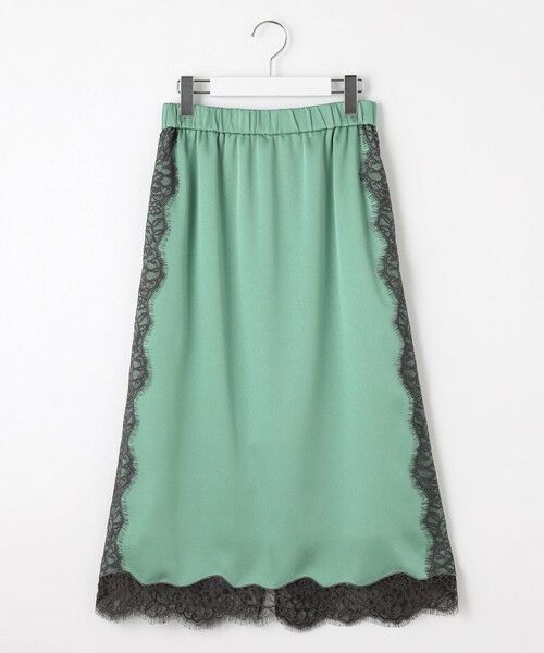 レース×サテン素材が上品で華やかなスカート■デザインすとんと落ちるサテン素材のナロースカートです。裾と脇にスカラップ付きレースを刺繍付けしているデザインが特徴です。1枚でコーディネートの主役になる、エレガントでモードなスカートです。ウエストは総ゴムなので着心地も良く、トップスを選ばず合わせやすい上品なレングスに仕上げています。※モデル画像はサンプルを使用しております。実際にお届けする商品は脇のレースの幅がやや狭くなります。正しい仕様は物画像(モデル画像ではない画像)をご参照ください。■素材表地には異形断面の特殊なポリエステルを使用したサテン素材を使用しております。膨らみ感と落ち感があり、適度なストレッチが特徴の素材です。レースはスカラップの形が特徴的なフラワーモチーフのレースです。