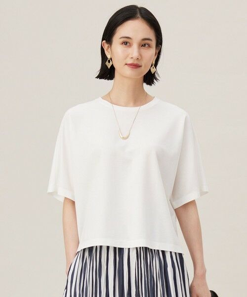 クロップド丈が今年らしいシンプル着映えTシャツ■デザインベーシックながらも、クロップド丈が今年らしさを感じるTシャツです。コンパクトな仕上がりで、シンプルなので着回しができ、着るだけでおしゃれ感がアップします。大人のTシャツらしく、縫製がすっきりと仕上がるように工夫されているのもポイントです。ワイドパンツに合わせたスタイリングがこなれ感が出ておすすめです。■素材高密度な加工を施した超細番手の綿糸と、特殊な技術を駆使したポリエステル糸を使用しています。2つの糸を組み合わせることで、清涼感のあるストレッチ性と軽量感も生まれ、シワにもなりにくい素材です。肌離れが良くさらりとした質感で、接触冷感、UVカット、吸水速乾、抗菌防臭の機能が付いているのもポイントです。■同素材アイテムフォルムTシャツ(KKW7GM0432)