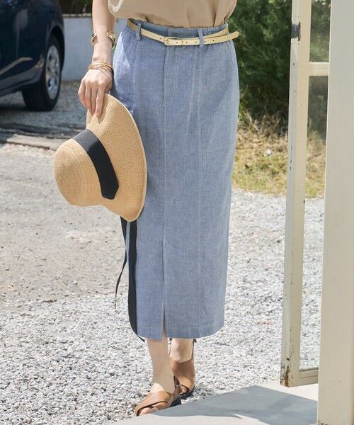 ストレートなラインが大人っぽさを演出するデニム見えスカート■デザインすっきりとしたストレートシルエットのスカートです。ベイカー風のポケットディティールがポイントです。フロントはスリット入りなので足さばきも良く、女性らしさを演出してくれます。ウエストは前脇から後ろにかけてゴム入りの仕様になっているので、快適な着心地です。ライトブルー系(073)にはオフ系、インディゴ系(075)には同色の太番ステッチを効かせ、カジュアルスカートながらに大人っぽく仕上げました。■素材コットンリネンの混紡糸を使用したツイル素材です。リネン混ならではのナチュラルな質感が天然素材らしい質感を表現しています。デニム見えのカジュアルな素材で、色落ちを気にせず着て頂けます。■同素材アイテムワイドパンツ(PRW7GM0512)