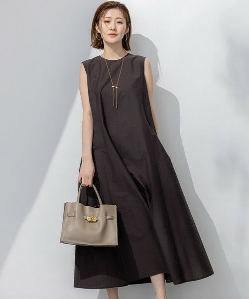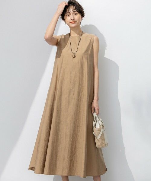 裾に向かってフレアが広がるノースリーブワンピース。シンプルなクルーネックで、上半身はすっきりコンパクトな作りにこだわり、1枚で着ても華奢見えするカッティング。羽織りアイテムを合わせてもかさばらないデザインに仕上げています。同素材のジャケット(品番:JKWOGM0506)とのセットアップスタイルも楽しめます。ペチスカートつき。カラーは、甘さを抑えた大人エレガントな雰囲気のあるキャメル(#034)、暑い時期にも落ち着いた洒落感をくれるダークブラウン(#035)の2色展開です。