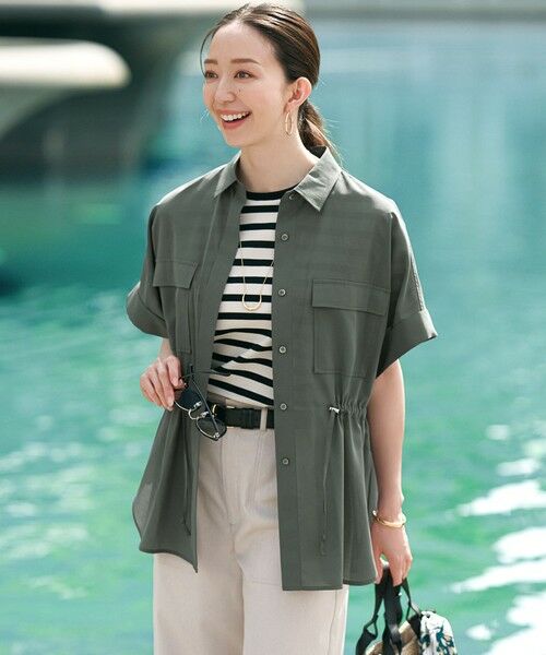 程よいシアー感が今っぽいミリタリーディティールのシャツ。ウエストの紐を絞ることでシルエットをこなれた雰囲気にアレンジできます。前をあけて羽織りのようにラフに着るスタイリングもおすすめです。腰回りを程よくカバーしてくれる長めのレングスなので、パンツやスカート、ワンピースなど様々なボトムと相性抜群で、着回しやすいアイテムです。カラーは、モードな雰囲気のブラック(#005)、カジュアルな印象のカーキ(#054)、優しい色合いのベージュ(#033)の2色展開です。