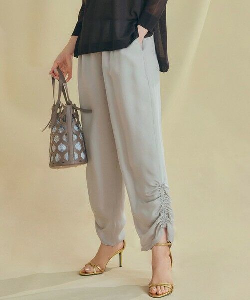 裾のシャーリングディテールが今年らしいポイントのカジュアルパンツ。程よい肉感のさらっとした肌触りと、リラックス感ある穿き心地のウエストゴム仕様など、シーズン問わず長く着用いただけるアイテムです。シンプルなシャツやTシャツ、カジュアルなニットをゆるく合わせた大人カジュアルな着こなしがおすすめ。カラーは、ナチュラルなエレガントさを演出するベージュ(#033)、洒落感が漂うダークブラウン(#035)、合わせやすいシックなブラック(#005)の3色展開です。