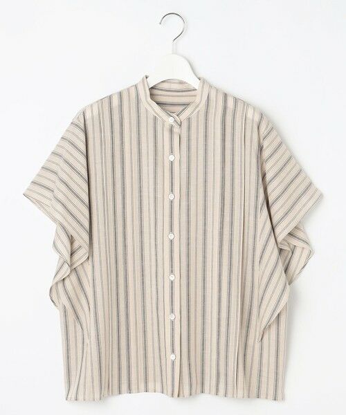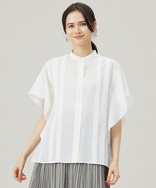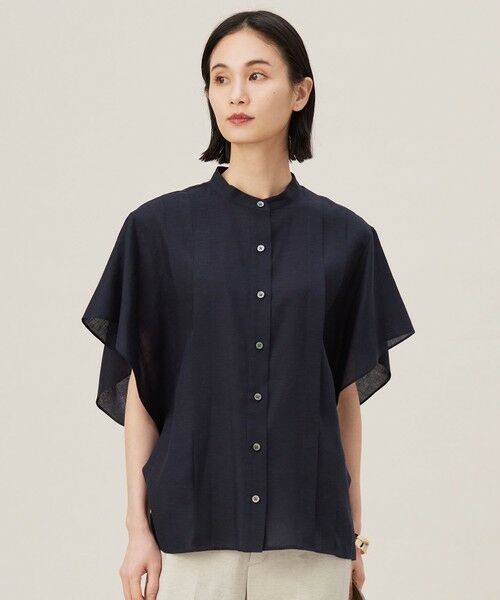 軽やかで女性らしいフレア袖のバンドカラーシャツ■デザイン軽やかなフレア袖が特徴のバンドカラーシャツです。前身頃に施したタックディティールがシンプルになりすぎず、お顔周りを華やかに見せてくれるデザインになっております。ボディラインを拾いにくいゆったりとしたシルエットで、しなやかな素材ならではのドレープ感が柔らかくフェミニンな印象です。■素材日本の先染め織物産地で有名な西脇地方で作られた平織り生地です。再生繊維(セルロース)とリネンの特殊な混紡糸を使用しております。再生繊維(セルロース)のさらりとしたドレープ性の中にリネン独特の表情と光沢感がブレンドされ、両繊維の長所を掛け合わせた素材に仕上がっています。接触冷感、吸水速乾の機能付きです。■同素材アイテムクロップド丈シャツ(BLW7GM0503)