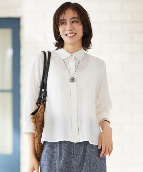 繊細なはしごレースが上品なクロップド丈シャツ■デザイン前立ての端に繊細なはしごレースを挟み込んだクロップド丈のシャツです。トレンドのクロップド丈でありながらも短すぎない着丈と、レースディティールの上品なバランスが着て頂きやすいアイテムです。プルオーバーのようにも、羽織りとして着ても今年らしいコーディネートになる1着です。※モデル画像はサンプルを使用しております。実際にお届けする商品は物画像(モデル画像ではない画像)をご参照ください。■素材日本の先染め織物産地で有名な西脇地方で作られた平織り生地です。再生繊維(セルロース)とリネンの特殊な混紡糸を使用しております。再生繊維(セルロース)のさらりとしたドレープ性の中にリネン独特の表情と光沢感がブレンドされ、両繊維の長所を掛け合わせた素材に仕上がっています。接触冷感、吸水速乾の機能付きです。■同素材アイテムフレア袖シャツ(BLW7GM0502)