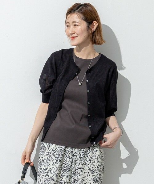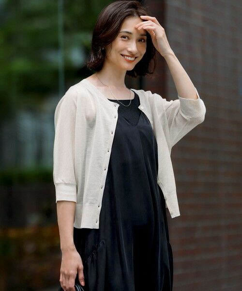 アームの締め付けのない、ドルマンスリーブの5分袖カーディガン。二の腕をカバーしつつ、上品な透け感のある素材で涼し気な印象です。襟はクルーネックで前後着用できるようにしています。裾のリブが腰で止まるような作りなので、コンパクトなプルオーバー風に着るのがおすすめです。カラーは、抜け感のあるアイボリー(#003)、ベーシックなブラック(#005)、ナチュラルな印象のブラウン(#030)、こなれ感のあるダークグリーン(#065)の4色展開です。
