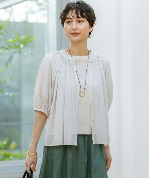 着るだけでサマになるティアードデザインのカットソー。程よくシアーな素材感で、たっぷり入ったギャザーも重くならず涼し気な印象を叶えます。レングスをやや短めにすることで、ワイドパンツやIラインスカートなど、ボトムを選ばず幅広いコーディネートを楽しめます。またボタンをあけて羽織としても使える万能アイテムです。カラーは、ベーシックなブラック(#005)、目を引くダークアプリコット(#014)、やさしい雰囲気のベージュ(#033)、ニュアンス感のあるダークブルー(#065)の4色展開です。