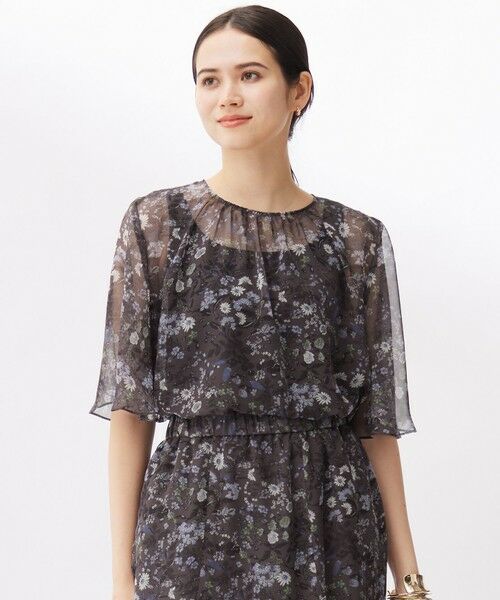 透け感のある素材やギャザーが上品で華やかなボタニカル柄ブラウス■デザイン様々なお花や葉のモチーフのボタニカル柄を、流れのある繊細なタッチで表現したブラウスです。前後の襟ぐりにギャザーをたっぷりと入れ、肌離れが良く涼しげなデザインに仕上げました。袖は肘にかかる長さなので、透け感がありながらも上品に着て頂けます。同素材のスカート(SKWMGA0009)とセットアップで着て頂くのもおすすめです。■素材繊細な軽やかさとしなやかさ、落ち感のあるシフォン素材です。シルク調の透け感のある素材は、暑い時期にも涼しげで軽やかに着て頂けます。■同素材アイテムスカート(SKWMGA0009)ワンピース(OPWMGA0009)