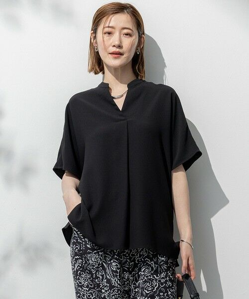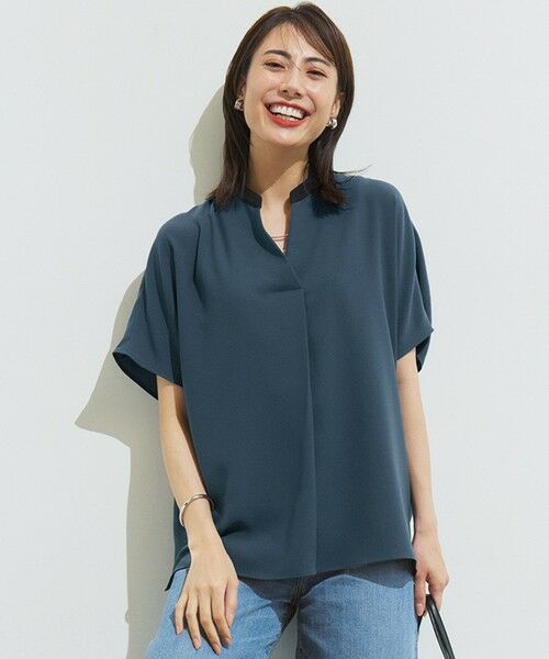 襟もとの開いたスキッパーディテールとバンドカラーがポイントのカットソー。顔回りがすっきり見える襟回りのデザインで、お仕事にもカジュアルにも活躍します。オフィスや華やぎの場所にも同素材のテーパードパンツやワイドパンツとのセットアップで大人っぽく着こなせ、カジュアルなワイドパンツに合わせてONにも着られます。カラーは、引き締まった印象のブラック(#005)、上品なネイビー(#075)、襟もととのコントラストが映えるベージュ×ブラック(#133)、ニュアンス感のあるダークグリーン×ブラック(#165)の4色展開です。配色づかいの襟は、シンプルな中にも洒落感をプラスしました。