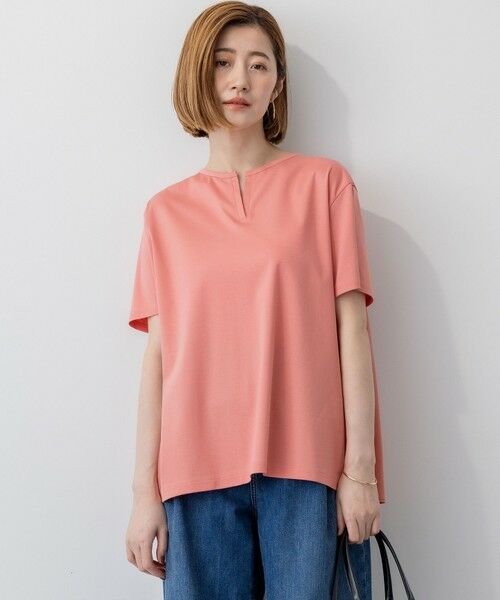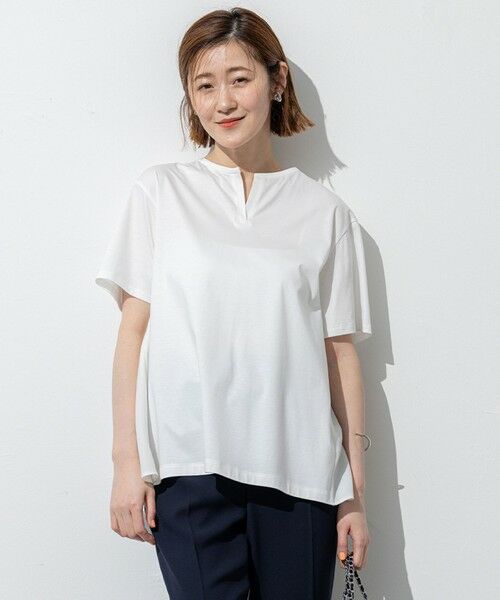 フロントはシンプルな半袖Tシャツに、後ろヨーク下からフレアに広がるタックをきかせたカットソー。布帛素材をコンビ使いすることで、涼し気で印象的なバックスタイルに仕上げました。脇の切り替えをやや前ふりにすることでウエスト周りがゆとりができ、気になる腰回りをさり気なくカバーできるのもうれしいポイント。シンプルなデザインながら、表情感のあるシルエットがいつものコーデに洒落感をプラスします。カラーは、爽やかなホワイト(#001)、印象引き締まるブラック(#005)、目を引くダークアプリコット(#014)、落ち着いた印象のダークブラウン(#035)の4色展開です。