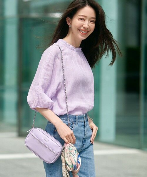 衿に、はしごレースを効かせたデザインブラウスです。はしごレースが華やかさを演出してくれます。LIBECO社のピュアリネンならではの素材感と、程よいボリューム感のエアリーな袖が雰囲気のある一枚です。程よくゆとりのあるシルエットふんわりと身体をカバーしてくれます。カラーは清涼感のあるホワイト(#001)、爽やかな印象のスカイブルー(#072)、シックなダークブラウン(#035)、トレンド感のあるダークグリーン(#065)、華やかなオールドローズ(#014)、おしゃれ感度の高いラベンダー(#083)の6色展開です。