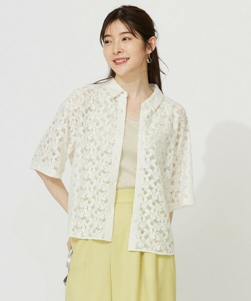 ・上品な印象のフラワーレース柄が印象的なシャツブラウス・着丈に前後差を付けることで、フロントINしても綺麗に見えるデザイン・シャツカラーでカジュアル過ぎず、きちんと見えも叶います・きらりと光るゴールドフチのボタンが上品さを演出