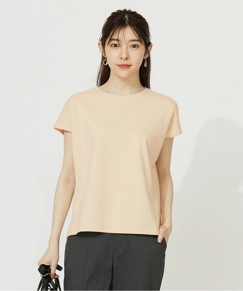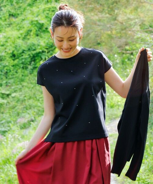 ・今シーズン注目のビジューを散りばめた着映えトップス・ボックスシルエットのシンプルな形ながら、コーディネートのポイントになる一枚・透けが気になりにくいポンチを使用しており、夏に着用しやすいアイテム・フレンチスリーブで二の腕をカバーし、袖下マチ付きで脇下もしっかりカバー・ボトムインしなくても様になる丈感