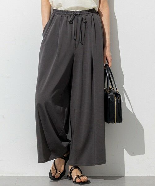 ウエストのギャザーとワイドシルエットで、リラックスした大人の印象漂うワイドパンツです。生地の分量をたっぷりととっており、ガウチョパンツのようなシルエットに。シワになりにくい素材のためアクティブに着用いただけます。またウエスト部分がドロスト仕様なので、イージーでストレスフリーな穿き心地です。接触冷感素材で、暑い日にも快適に着られるのもうれしいポイント。同素材のタックディテールを利かせたトップスとセットアップで大人なスタイリングがおすすめです。カラーは落ち着いた印象のグレー(#004)、ベーシックなブラック(#005)、抜け感をプラスするブラウン(#030)の3色展開です。