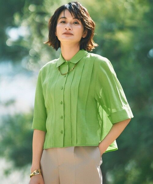 羽織りとしても活躍するゆったりシルエットのブラウス■デザインゆとりのあるシルエットと太めの袖がポイントの、クロップド丈ブラウスです。タックから生み出されるシアー素材の重なりが繊細な奥行きを感じられ、程よく華やかなブラウスになっています。ワイドパンツなどボリューム感のあるボトムを合わせて、今年らしいバランスのコーディネートもおすすめです。前を開けてワンピースなどに合わせて羽織りとしても着て頂けます。■素材ハリコシのあるラミーと柔らかいセルロース系再生繊維を混紡することにより、さらりとしたドライ感がありながらもしなやかさも兼ね備えた、程よいシアー感のある素材です。天然素材であるラミーの良さを生かしつつ、きれいめに仕上げているので、カジュアルになり過ぎず大人っぽさを感じられる素材感です。さらりとしたタッチの薄地で、接触冷感機能もあるので、暑い夏にもおすすめの素材です。麻高混率でありながらも鋭利なシワが付きにくく、洗いざらしでも程よいナチュラルさで着て頂けます。■同素材アイテムフリルブラウス(BLW7GA0105)イレギュラーヘムスリーブブラウス(BLW7GA6702)フレンチスリーブワンピース(OPW7GA0105)シャツワンピース(OPW7GA6702)