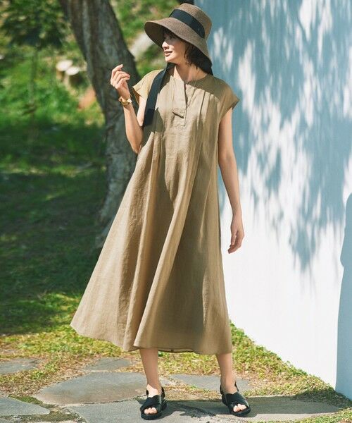 タックディテールとテントラインのボリューム感が華やかなワンピース■デザイン前後の身頃にたくさん取ったタックディテールから繋がるドレープと、裾に向かって広がるテントラインが華やかなワンピースです。タックから生み出されるシアー素材の重なりが繊細な奥行きを感じられます。襟ぐりはキーネックで程よい抜け感を感じられ、ボディラインを拾いにくいシルエットなので、涼しく着て頂けます。■素材ハリコシのあるラミーと柔らかいセルロース系再生繊維を混紡することにより、さらりとしたドライ感がありながらもしなやかさも兼ね備えた、程よいシアー感のある素材です。天然素材であるラミーの良さを生かしつつ、きれいめに仕上げているので、カジュアルになり過ぎず大人っぽさを感じられる素材感です。さらりとしたタッチの薄地で、接触冷感機能もあるので、暑い夏にもおすすめの素材です。麻高混率でありながらも鋭利なシワが付きにくく、洗いざらしでも程よいナチュラルさで着て頂けます。■同素材アイテムフリルブラウス(BLW7GA0105)クロップド丈ブラウス(BLW7GA0106)イレギュラーヘムスリーブブラウス(BLW7GA6702)シャツワンピース(OPW7GA6702)