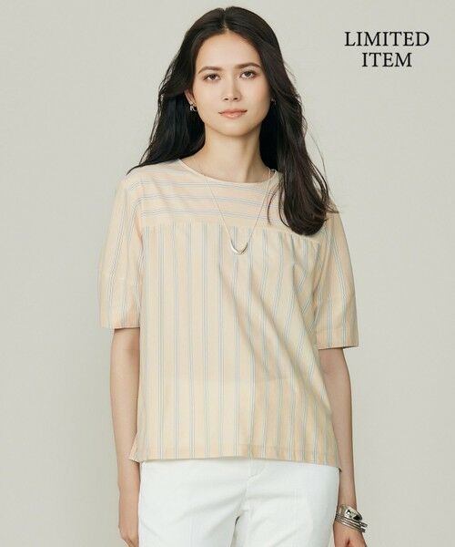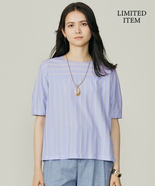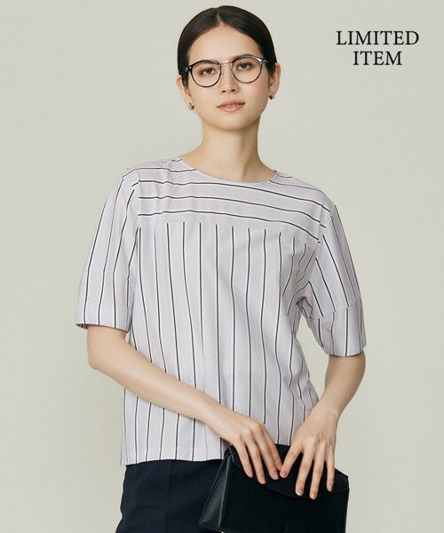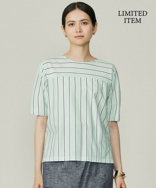 ストライプ柄が爽やかで暑い夏におすすめのカットソー■デザインストライプの柄を活かした縦横の切り替えがキャッチーな、ブラウスライクなカットソーです。袖のフォルムがアクセントになっています。シンプルなデザインで、パンツやスカートなど合わせるボトムを選ばないので、着て頂きやすいアイテムです。■素材46ゲージの希少なハイゲージ機で編み立てたキレイめな印象のジャージー素材です。肌離れのよい盛夏向けの素材です。