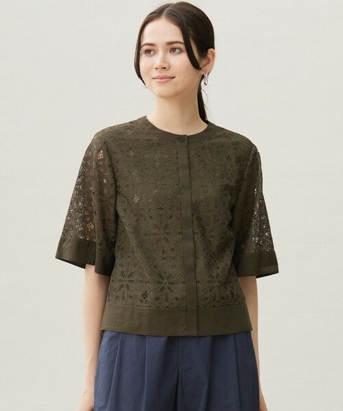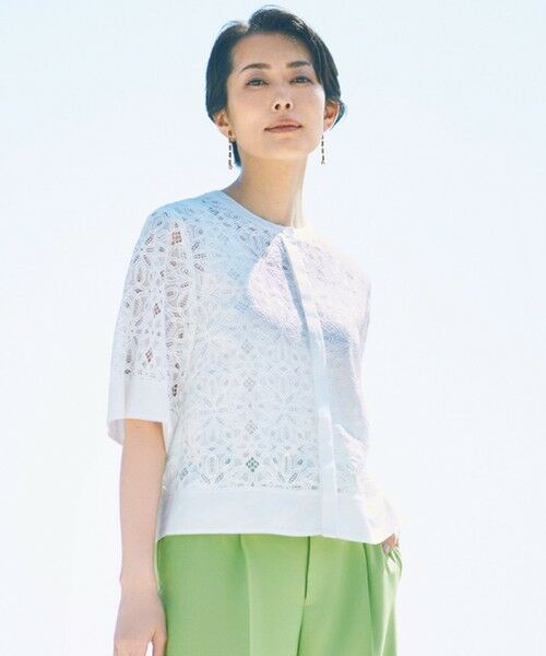レースと無地の切り替えがポイントになったブラウス■デザインクルーネックの前開きレースブラウスです。ボクシーなラインと、やや広めのお袖でさらりと着て頂けます。襟ぐりと袖口、裾の切り替えには無地の別布を使用したデザインになっています。釦を開けて羽織りとしても着用でき、かしこまり過ぎずカジュアルに着こなせるレースブラウスです。■素材物性強度が高く耐光にも優れたポリエステル素材を使用しております。地となるネット目は引っ掛かりにくく、ポリエステル素材でありながらなめらかな風合いとなっております。どの角度からカットしてもほつれない組織になっています。■同素材アイテムパンツ(PRW7GA0203)ワンピース(OPW7GA0203)
