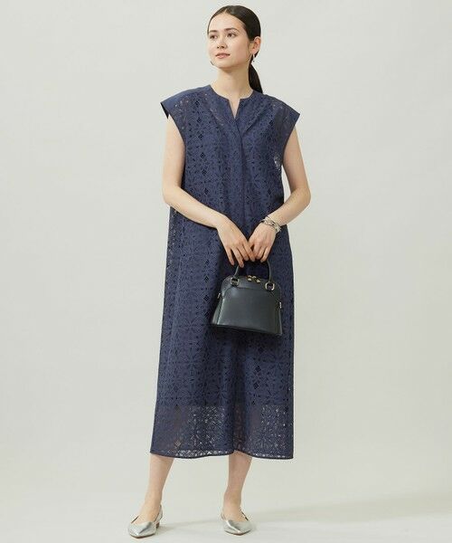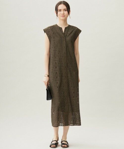 ストレートシルエットとキーネックのデザインがすっきりとした印象のレースワンピース■デザインストレートシルエットの総レースワンピースです。首元はキーネックなのでお顔周りをすっきりと見せてくれ、涼やかな印象です。エレガント過ぎないレースで仕上げた、デイリーに着まわせる1着です。部分的に無地の別布で引き締めることで、レースのデザイン性を際立たせています。程よくゆとりのあるシルエットでお作りしているので、ボディラインを拾いにくく、すっきりとした印象で着て頂けます。※画像はサンプルを使用しております。実際にお届けする商品は脇部分にマチが付きます。■素材物性強度が高く耐光にも優れたポリエステル素材を使用しております。地となるネット目は引っ掛かりにくく、ポリエステル素材でありながらなめらかな風合いとなっております。どの角度からカットしてもほつれない組織になっています。■同素材アイテムブラウス(BLW7GA0203)パンツ(PRW7GA0203)