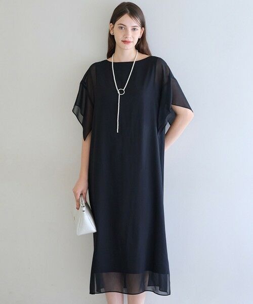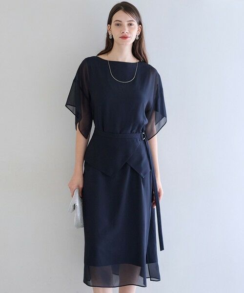 シアーな素材を使ったシンプルなドレスと別布ベルトをセットにした着回しを楽しめるデザインドレス。袖はハンカチーフヘムにすることでシンプルながら動きのあるデザイン。さりげなく気になる二の腕もカバーします。 1枚でさらりと着用してもシルエットが美しく、またお好みで着脱可能の別布ベルトでシルエットや雰囲気を変えてもお楽しみいただけます。カラーは、清楚な気品が漂う黒色に近いネイビー(#075)、シックな雰囲気を引き立てるブラック(#005)の2色展開です。