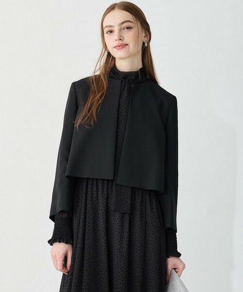 センターバックにタックを入れ、ややボリュームをもたせたノーカラージャケット。ドレスと合わせてバランスのよい、広がりすぎない分量感とレングスにこだわり、体のラインを程よくカバーしながら、きちんと見えするすっきりとしたデザインです。袖口にさりげなくスリットを入れることで、袖デザインのあるドレスとも相性がよく、着心地よく仕立てています。華やかなシーンにはもちろん、お仕事、学校行事などにも着回しの効くデザインです。シックな魅力を引き立てるブラック系(#005)と清楚な雰囲気の濃いめのネイビー系(#075)の2色展開です。