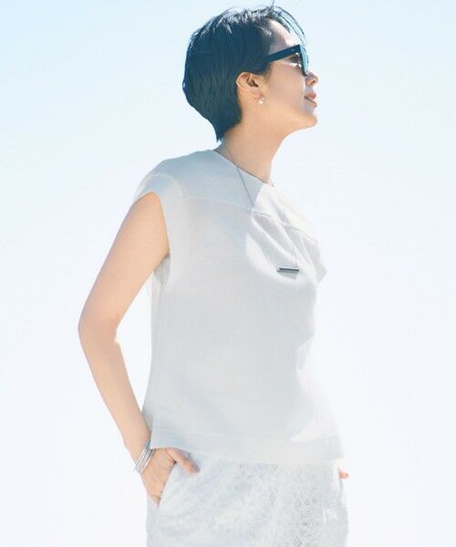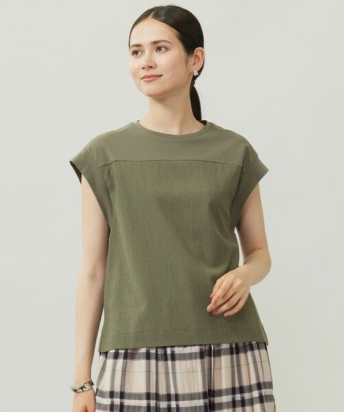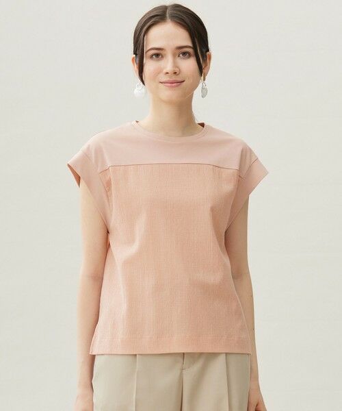 1枚でもシャツやジャケットを羽織っても着て頂ける異素材ブロッキングカットソー■デザイン胸位置で切り替えた異素材ブロッキングがビスチェをレイヤードしているように見えるデザインカットソーです。すっきりとしており、ジャケットやシャツを羽織っても着て頂きやすいシルエットになっています。長過ぎない程よい丈感なので、インでもアウトでも着て頂けます。■素材特殊な編み機を使用し、織物のように経糸に緯糸を絡ませて編んでいくため、織物より密度が詰まっておらず軽量なことが特長です。ポリエステルと綿を交編し、さらにリネンをいれることで独特の組織感のある素材になっています。■同素材アイテムペプラムカットソー(KKW7GA0231)