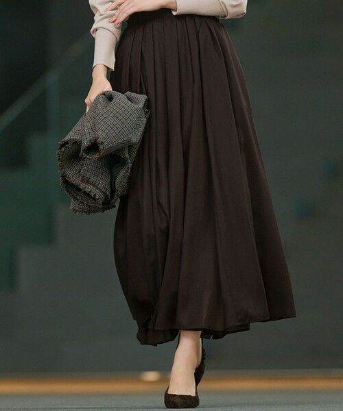 贅沢に生地を使用したフレアシルエットのギャザースカート。シアーな素材感を生かし、生地の分量がありながら軽量感のあるスカートに仕上げました。ウエストベルト部分にはタックを入れ、デザインポイントにしています。同素材のブラウスと合わせてワンピース風に着ていただくのはもちろん、Tシャツと合わせても上品な印象のスタイリングに仕上がります。カラーは、印象引き締まるブラック(#005)、フェミニンさのあるダークブラウン(#035)の2色展開です。