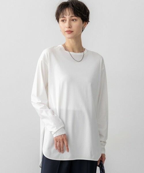 ストレッチ性のあるリブで切り替えた襟がポイントの、ミニマルなクルーネックロングTシャツ。ニットとのレイヤードスタイルで着こなしにニュアンスを加える裾のシャツテールは、23区定番のデザイン。一枚でもサマになり、カジュアルからきれいめまで幅広いコーディネートに活躍します。シンプルながらも洗練されたデザインで、ワードローブに一枚あると重宝すること間違いなしのアイテムです。