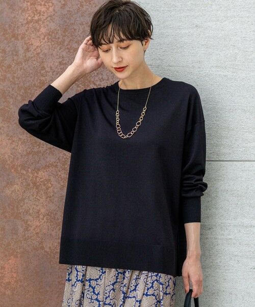 繊細なラメの光沢感が秋のムードを高めるニット。ややゆったりとしたサイズ感で、脇裾にグログランテープを使ったスリットがアクセントになっています。ヒップにかかる丈なので、気になる部分をカバーしつつ、ウエストインしても薄手のためごわつきません。スリットを活かして、アウトで着用する際もすっきりと決まります。カジュアルからきれいめまで幅広いスタイルにマッチし、一枚で着てもレイヤードスタイルでも様になる、着回し力抜群のアイテムです。秋のスタイリングに映えるカラー展開で、深みのあるグレー(#004)、印象引き締まるブラック(#005)、パッと目を引くオレンジ(#020)、やわらかな印象のベージュ(#033)、洒落感をプラスするサックスブルー(#073)の5色展開です。