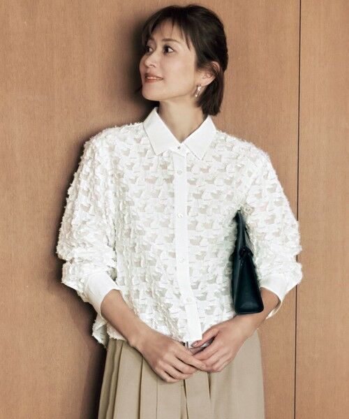 華やかなカットジャカード素材でコーディネートが決まるブラウス■デザイン身頃と袖部分に華やかなカットジャカード素材を使用した、トレンドのクロップド丈ブラウスです。襟とカフス、前立てに使用した同色の無地生地とジャカード素材が、程よく素材コントラストを効かせたデザイン性の高い1着です。エレガント過ぎないデイリーに着まわせる幾何柄のカットジャカードで、シンプルなボトムに合わせるだけで華やかなコーディネートが完成します。少し前後差のある着丈なので、クロップド丈でありながらも腰回りを程よくカバーするバランス感で、ワイドパンツやスカートなどボリュームのあるボトムと好相性です。■素材ジャカード素材は、タテ糸に細番手のナイロン、ヨコ糸に綿キュプラを使用しております。ナイロンの透け感、光沢感と綿糸のナチュラル感、マットな素材感のコントラストが印象的な素材です。たっぷりと毛足の出た表情で、幾何柄でありながら華やかな印象になっています。無地部分は、タテ糸にアセテートとレーヨン、ヨコ糸にオーガニックコットンを使用したサスティナブル素材です。薄地でありながらも繊細なシャンブレーで表現されたカラーが奥行きを感じられリッチな印象になっています。しなやかで涼し気なタッチと、適度なツヤが上品で、大人っぽい素材です。無地部分タテ糸のアセテートはFSC認証、ヨコ糸のオーガニックコットンはGOTS認証を取得しています。■同素材アイテムプルオーバーブラウス(BLW7GW0309)