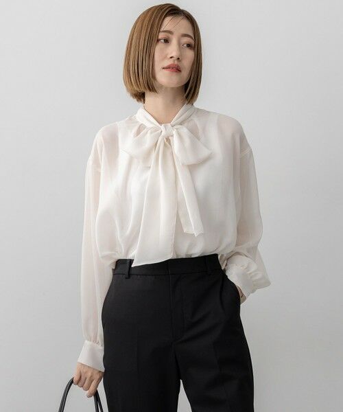 透けすぎないけれどきれいなシアー感のある素材にこだわりました。ボウタイ部分は蝶々結びや片結びなど気分に合わせて様々なアレンジをお楽しみいただけます。1枚でも華やかですが、ジレやニットなどレイヤードアイテムとしても合わせて着るのもおすすめ◎。デイリーやお仕事ブラウスとしても活躍する、持っていて損のないブラウスです。カラーは、上品でエレガントなアイボリー(#002)、差し色にもなるダルブルー(#074)、シックでモードな印象のブラック(#005)の3色展開です。
