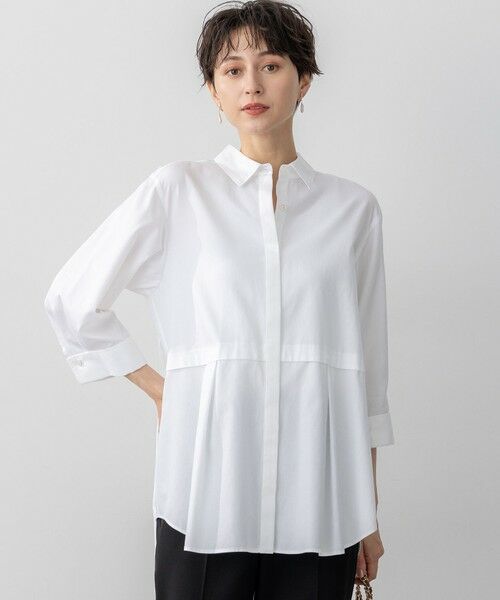 1枚でもサマになりますが、ルレックスバルキー5分袖 ラメ ニット (品番:KRWOGA0356)とのレイヤードスタイルも華やかにまとまり、おすすめです。袖口のダブルカフスがポイントです。ウエストで切り替えた長めのシャツテールデザインが腰回りをしっかりとカバーしてくれるので、安心してゆったりと着こなせます。
