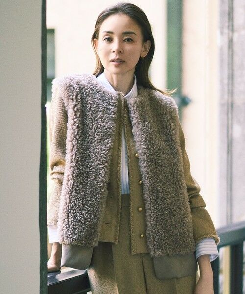 羽織るだけでスタイリングが華やぐエコファー素材のジレ■デザイン裾部分をスエードで切り替えたクルーネックのエコファージレです。柔らかく軽やかなくりくりとした巻き毛が程よくカジュアル感があり、コーディネートしやすいアイテムです。フロントはホックの仕様なので、止めても着て頂けます。ボリュームスリーブのブラウスや、ワンピースとも好相性で、羽織るだけで一気にコーディネートのポイントになります。■素材エコファー部分は、カルガンラムのようなくりくりとした巻き毛が特徴の素材です。長めのファーをカール加工することによって肌触りが良くなり、軽やかでありながら保温性の向上にも繋がっています。別布のスエード部分は、軽く柔らかな仕上がりの人工スエード素材です。