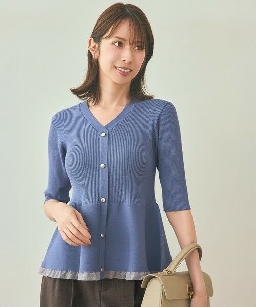 ・ペプラムシルエットがエレガントな印象を与えるニットプルオーバー・フロントのゴールドボタンと、裾からのぞくシアーなフリルが華やかなポイント・立体感のあるペプラムのフレアが腰回りをすっきりカバー・開きすぎていない上品な襟元と、リブでもぴったりしすぎない程よいフォルムで着心地も◎