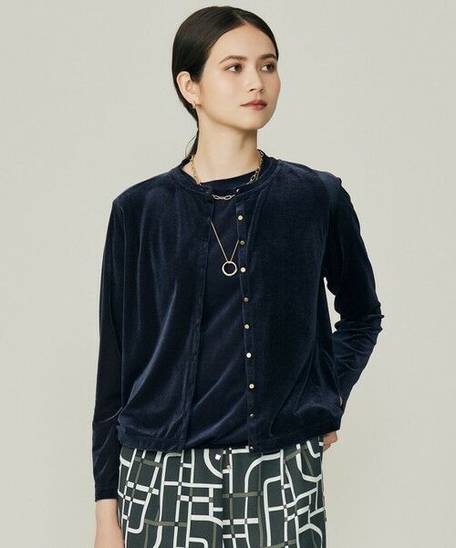 程よい透け感がポイントのベロア素材カーディガン■デザインややコンパクトなシルエットのベロア素材のカーディガンです。クラシカルなカーディガンは素材に表情があり、シンプルながらスタイリングのアクセントになるアイテムです。■素材透け感のあるベロア素材です。絶妙な透け感と光沢感でニュアンシーな雰囲気を楽しめます。レイヤードでのアクセント使いから1枚着トップスなど、様々なアイテムで活躍するトレンド素材です。■同素材アイテムカットソー(KKW7GW0333)