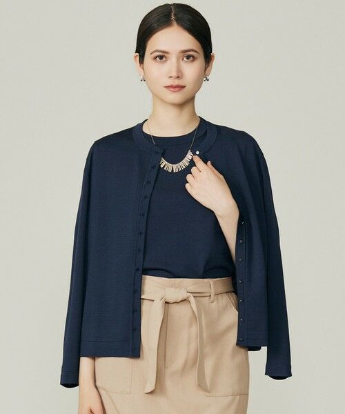 シルエットにこだわった上品なカーディガン■デザイン素材の持つ上品な光沢感を活かしたシンプルなカーディガンです。クラシックな雰囲気になりすぎないように、少しだけ肩をドロップさせリラックスしたシルエットに仕上げています。アクセサリー感覚の華奢で小さなメタル釦は間隔を狭めて配置し、自由区のオリジナリティを感じさせるディテールです。パターンメイキングされた、美しいシルエットにこだわったベーシックアイテムになっています。同素材のプルオーバーニット(KRW7GW0357)とアンサンブルでの着用もおすすめです。■素材程よいハリコシと上品な光沢が特徴で、ソフトでシャリみのある発色が美しい素材です。表面はアセテートの繊細な光沢が女性らしく滑らかなタッチで、肌につく裏面は肌触りの良いコットン素材なので、暑い時期から通期にわたり着用できるアイテムです。■同素材アイテムプルオーバーニット(KRW7GW0357)
