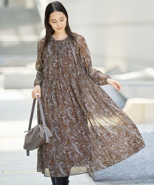 ドラマティックなボリューム感と大胆な柄が目を惹くプリントワンピース■デザイン襟周囲にシャーリングディテールを入れてたっぷりとギャザーを施したAラインのワンピースです。ラグランスリーブや、ウエスト部分にタックとギャザーを施すことで、ドラマティックなボリューム感のあるけまわしを取り、上品で優雅な雰囲気がポイントになっております。■素材表面の凹凸とシフォンの落ち感が特徴の素材です。デザインは、1980年代のインテリアに使用されたリヨン産のペイズリー柄からアレンジした自由区オリジナルプリントで、大胆でエレガントな表現を大切にお作りしました。■同素材アイテムブラウス(BLW7GW0414)※画像はサンプルを使用している為、実際にお届けする商品と仕様、加工、サイズが若干異なる場合がございます。予めご了承ください。※撮影環境の都合上、実際の商品と色味が異なって見える場合がございます。洗濯表示【本体】40℃まで手洗い可 塩素系漂白不可 タンブル乾燥不可 日陰つり干し乾燥 アイロンは160℃まで 弱いドライクリーニング(石油系)可 弱いウェットクリーニング可